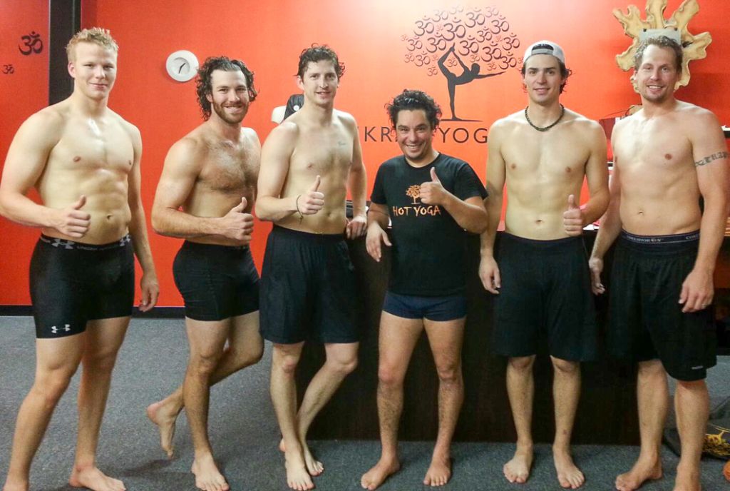 Below: Lars Eller, Prust, Colby Armstrong, instructor Alain Robin, Carey Price and Travis Moen promoting the benefits of yoga for Hockey players.