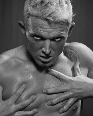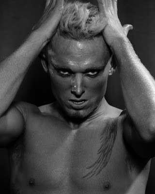 Indiana's Trevor Werner has the perfect look, not to mention story, to bring Sweeney Todd to life. Incredibly stunning, the combination of his striking blonde hair, blue eyes and smooth skin create dramatic results when captured by Jay's lens. Never content with just being 'hot' or 'cute', Trevor prefers edgier types of shoots so the Sweeney Todd theme was right up his alley. Another, more obvious reason reason why Sweeney Todd fit Trevor so perfectly was he is actually a hairstylist and just inherited his families barber shop. If in the Indiana area you may, or may not, want to chance a trim at Trevor's shop. Just be wary of asking for a snack.