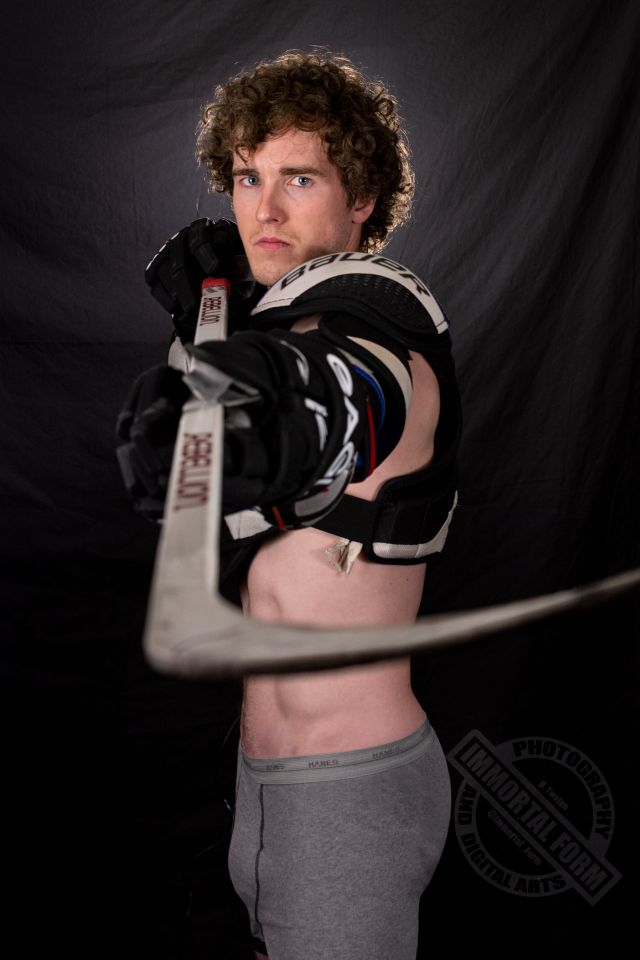 We started shooting with more slapshots, only nude this time. He was initially awkward I think, but got into the groove quickly. We did a few figure shots with the hockey equipment and he was really enjoying the shoot so I asked Ethan to take it all off.